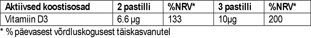 Kasutusjuhend: Üle 3-aastased lapsed ja täiskasvanud: 2-3 pastilli päevas lahustuvad suus aeglaselt.